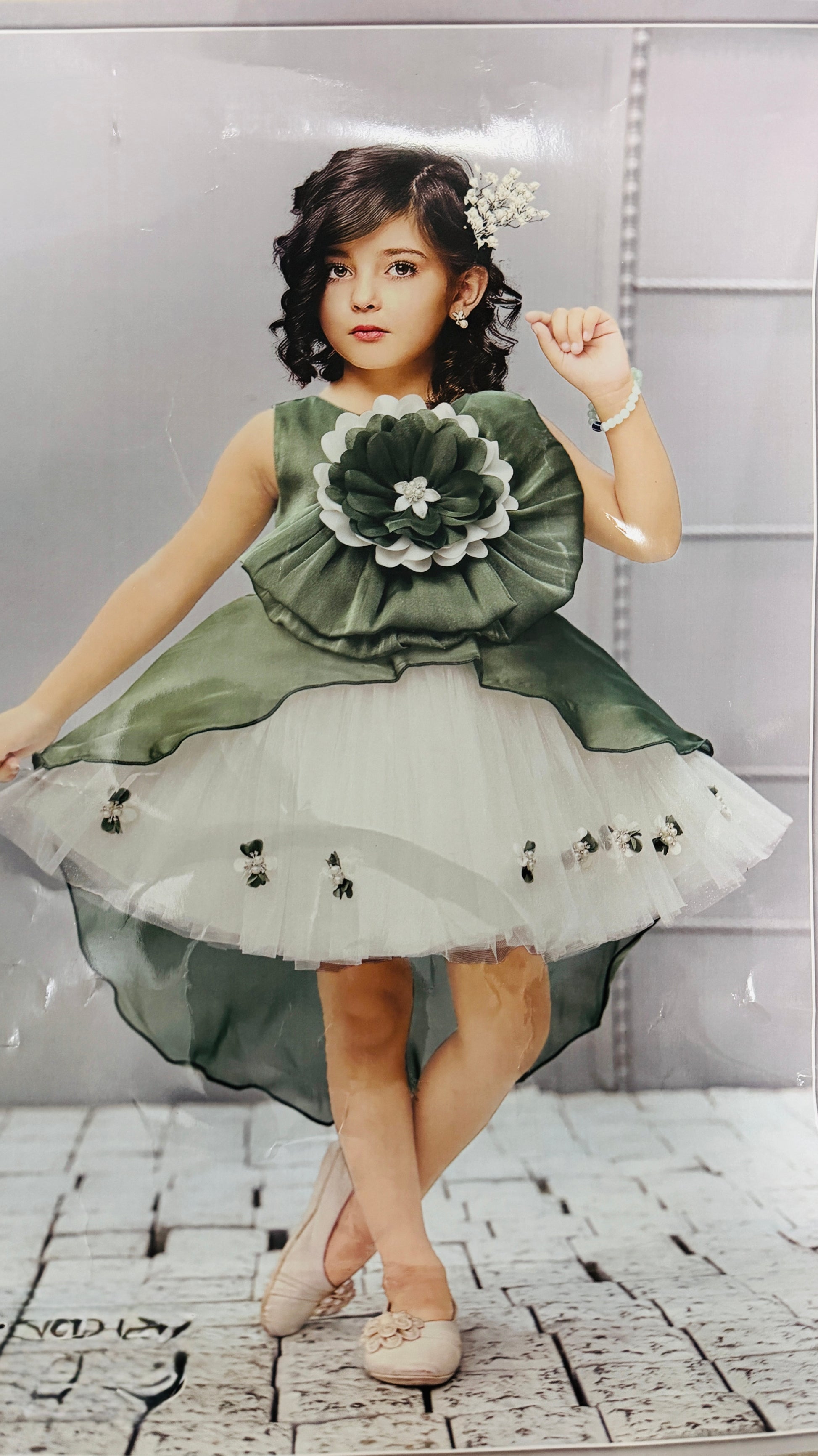 Turn every occasion into a magical memory with this Elegant Green & White High-Low Party Dress for girls. Designed with charm and grace in mind, this dress features a dramatic high-low satin overlay and a voluminous white netted skirt embellished with tiny floral appliques .