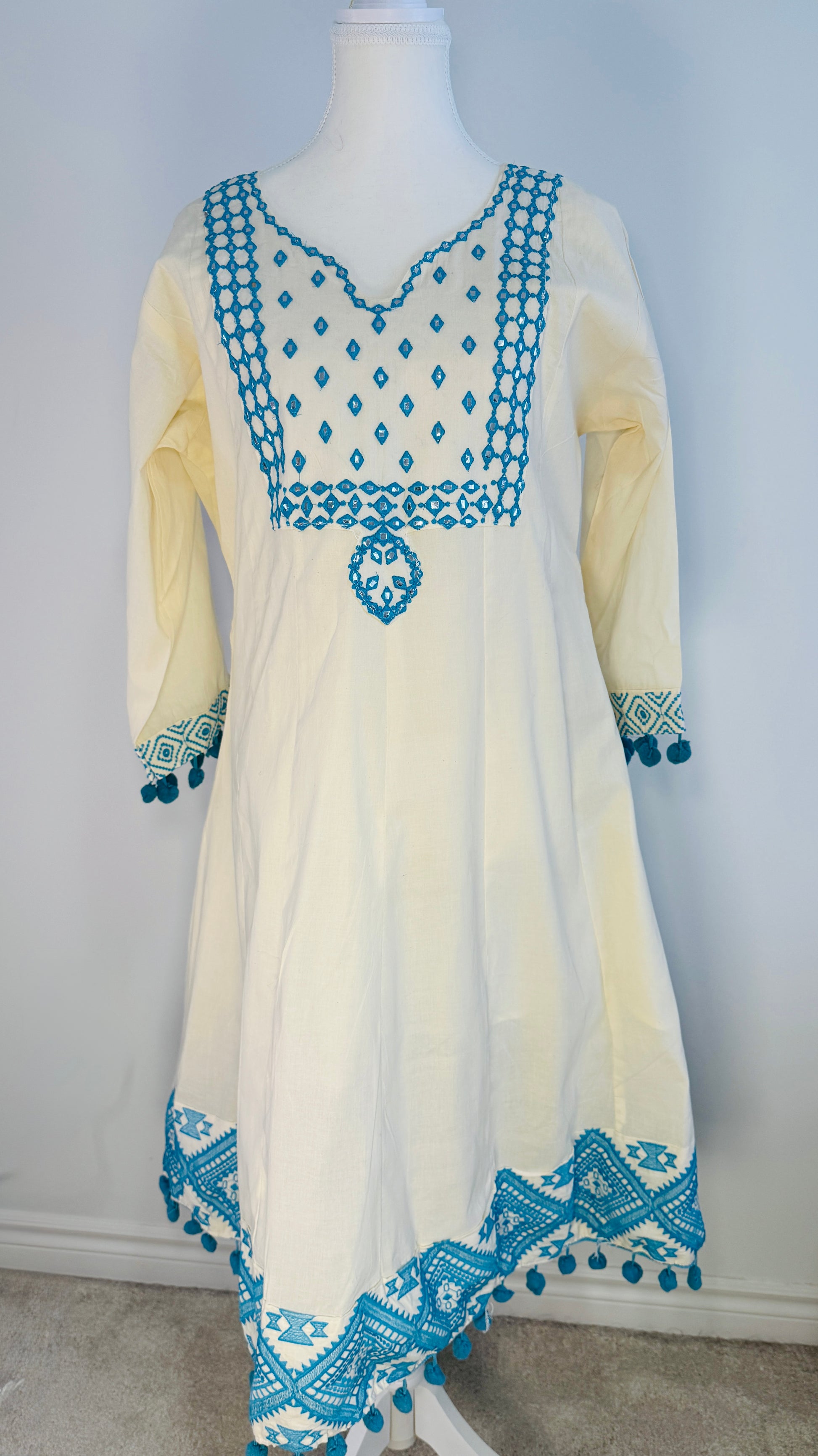 Off-White Cotton Kurti with Blue Mirror Work Embroidery & Pom Pom Dupatta